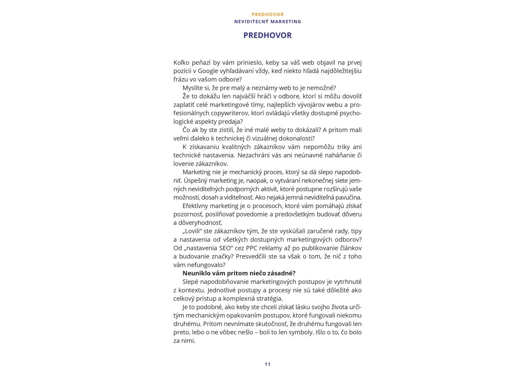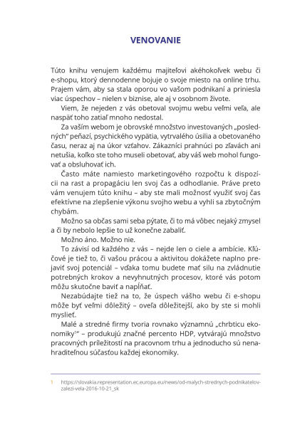 Táto kniha je venovaná každému majiteľovi akéhokoľvek webu či e-shopu, ktorý dennodenne bojuje o svoje miesto na online trhu. Ak ste do svojho webu obetovali obrovské množstvo „posledných" peňazí, psychického vypätia, vytrvalého úsilia a času, no naspäť ste toho zatiaľ veľa nedostali, potom táto publikácia je pre vás kľúčová.