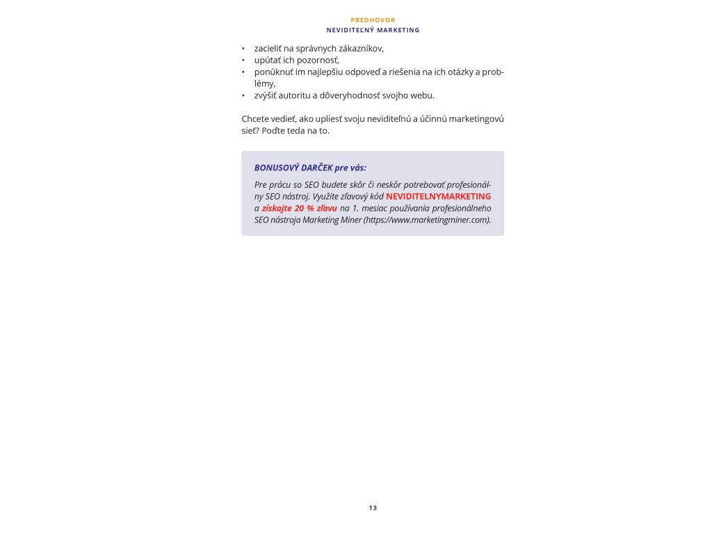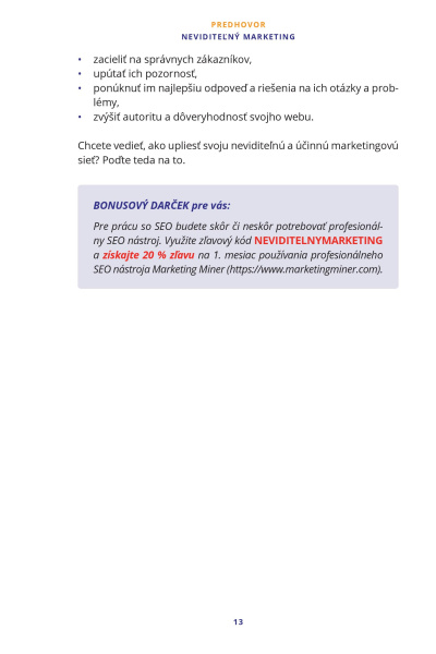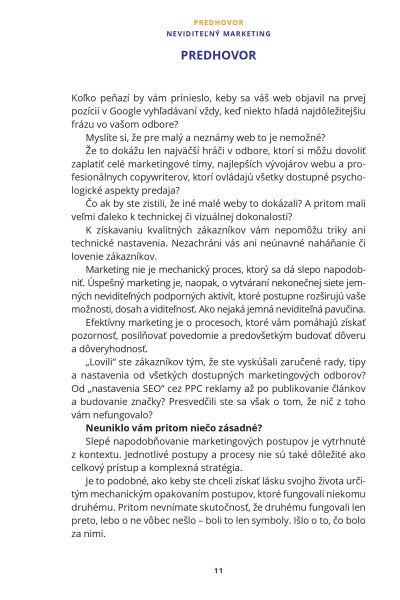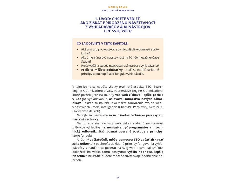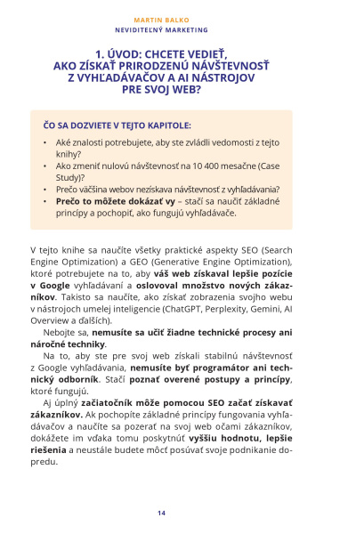 Kniha Neviditeľný marketing je komplexný praktický kurz, ktorý vás naučí, ako získať prirodzenú návštevnosť z vyhľadávačov a AI nástrojov a ako dostať svoj web na TOP pozície v Google vyhľadávaní.